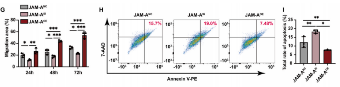 为了研究JAM-A在受损DPCs中的关键作用以及随后对自噬和Wnt/β-catenin通路的影响,作者通过慢病毒转染建立了JAM-A过表达、JAM-A干扰(JAM-ASi)和JAM-A对照细胞系(JAMANC)。图3D~I的结果表明,JAM-A的下调显著降低了DPCs抵抗DHT和巨噬细胞损伤的能力,表现为衰老和凋亡细胞的增加以及增殖和迁移能力的降低。反之,JAM-A的过表达可以激活DPCs,从而有效对抗DHT和巨噬细胞诱导的损伤。
